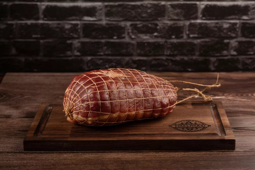 Tóalmási rökt skinka tillverkas av benfria, skinnade fläskben.